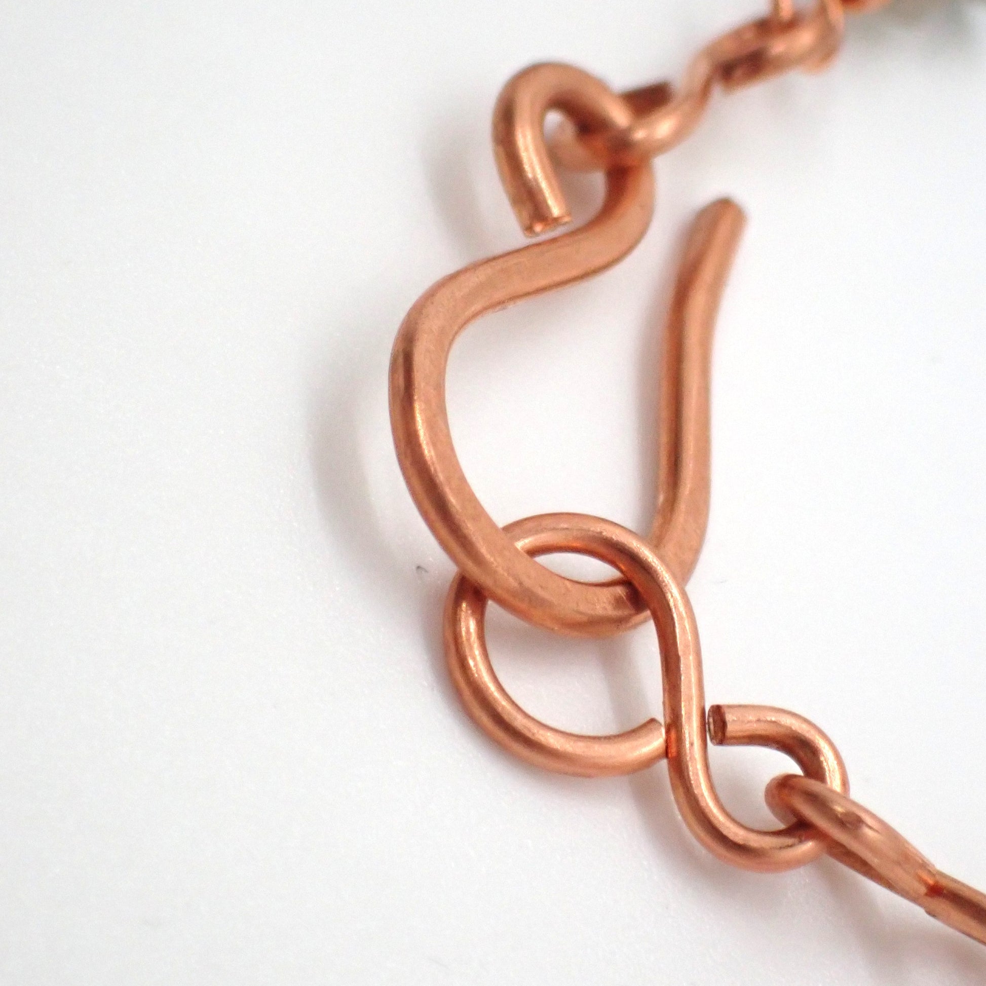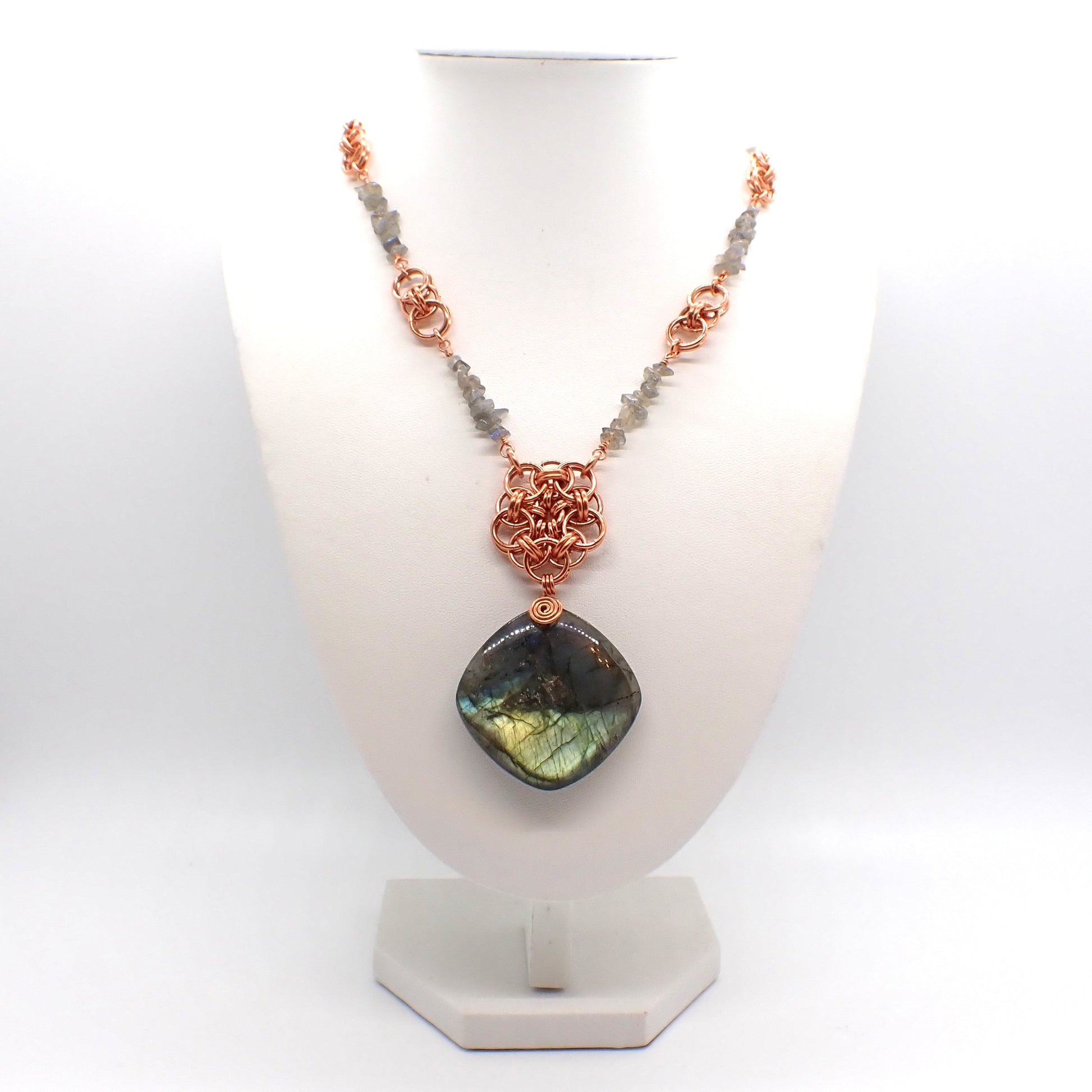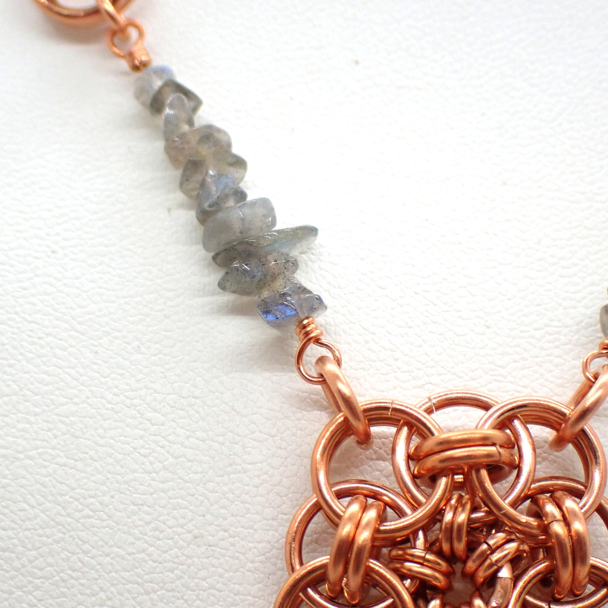 Sections of copper chainmail links lend an air of strength and ancient craftsmanship, while sections of labradorite chips add an organic, untamed energy.